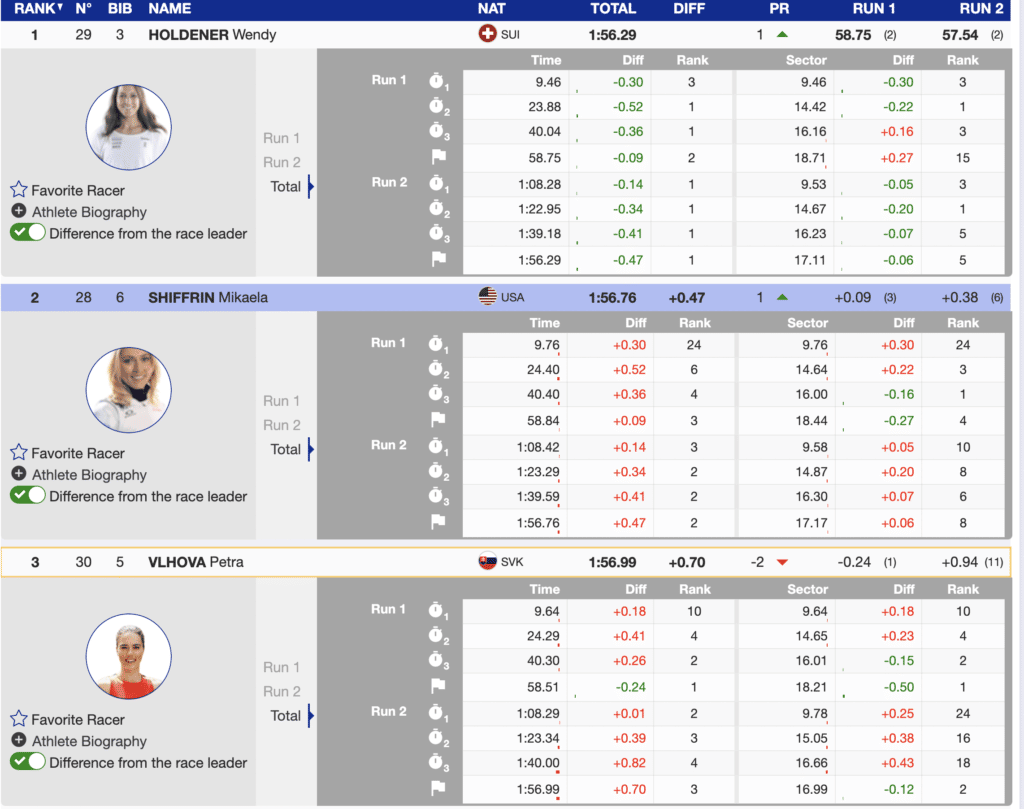 When you are great, even your good days are exceptional. That describes Mikaela Shiffrin’s race. Shiffrin moved up one spot to finish second but could not match the performance of Holdener. However, she has bounced back from a frustrating Saturday GS to stand on another podium.