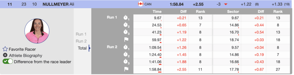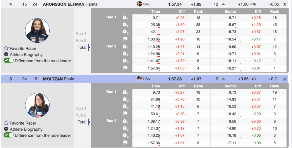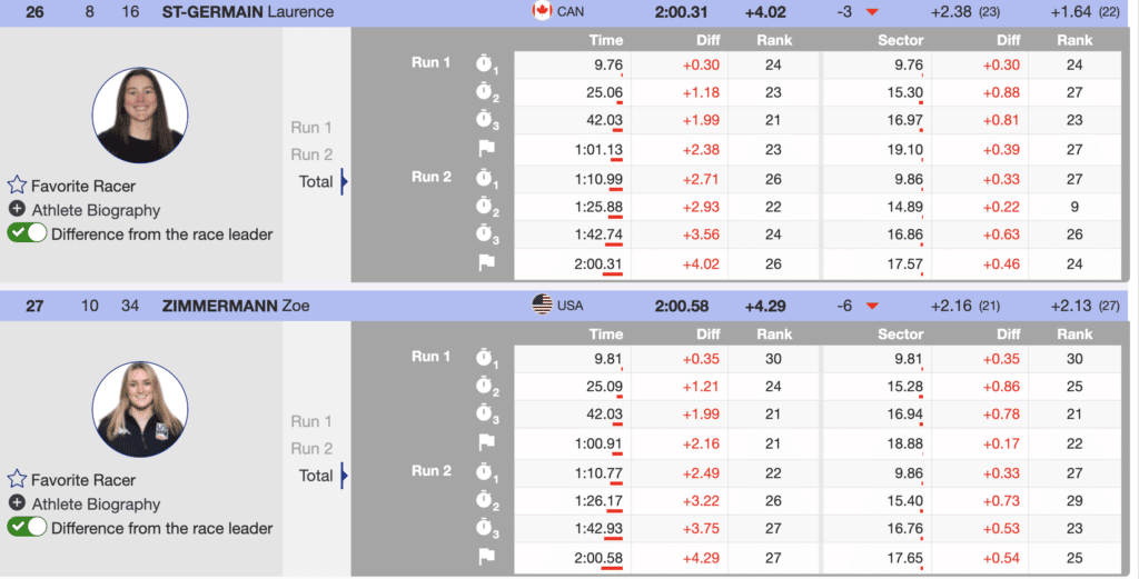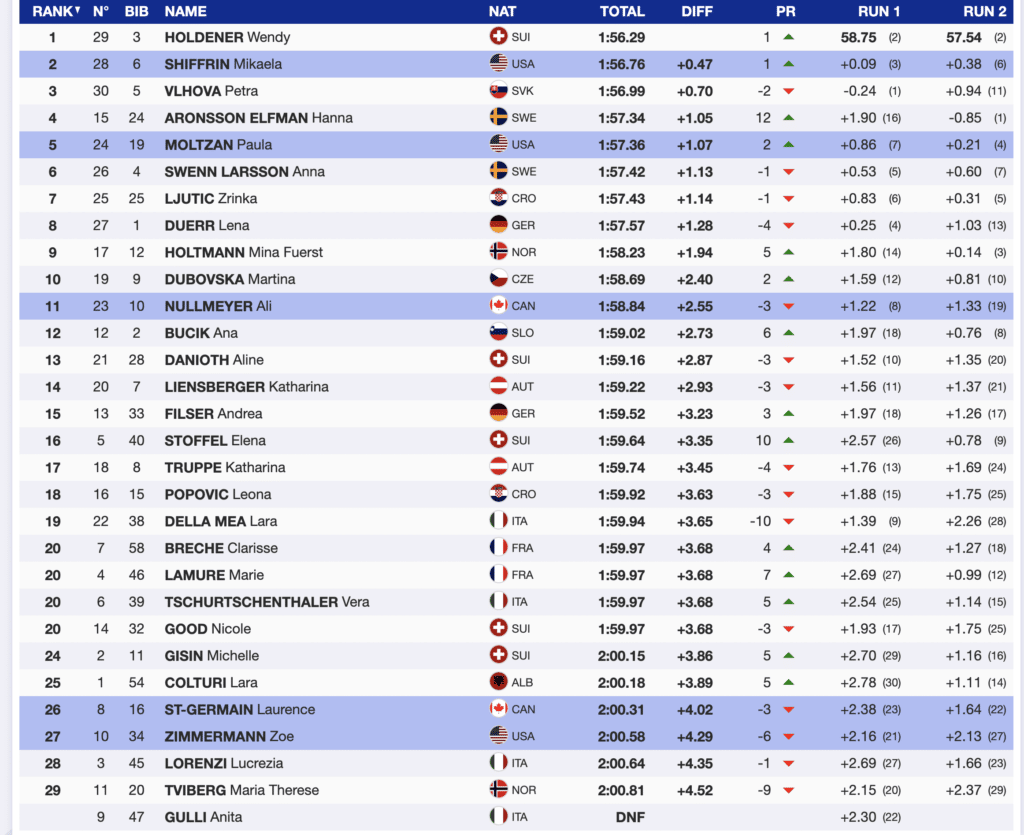 Immediately behind St-Germain in the results is US’s, Zoe Zimmermann. Although unhappy with her second run, she will celebrate her first-ever World Cup points. She can be proud of accomplishing a significant career milestone. Her performance, while expected, is additional proof that US women are rising and becoming a force on the SL tour.