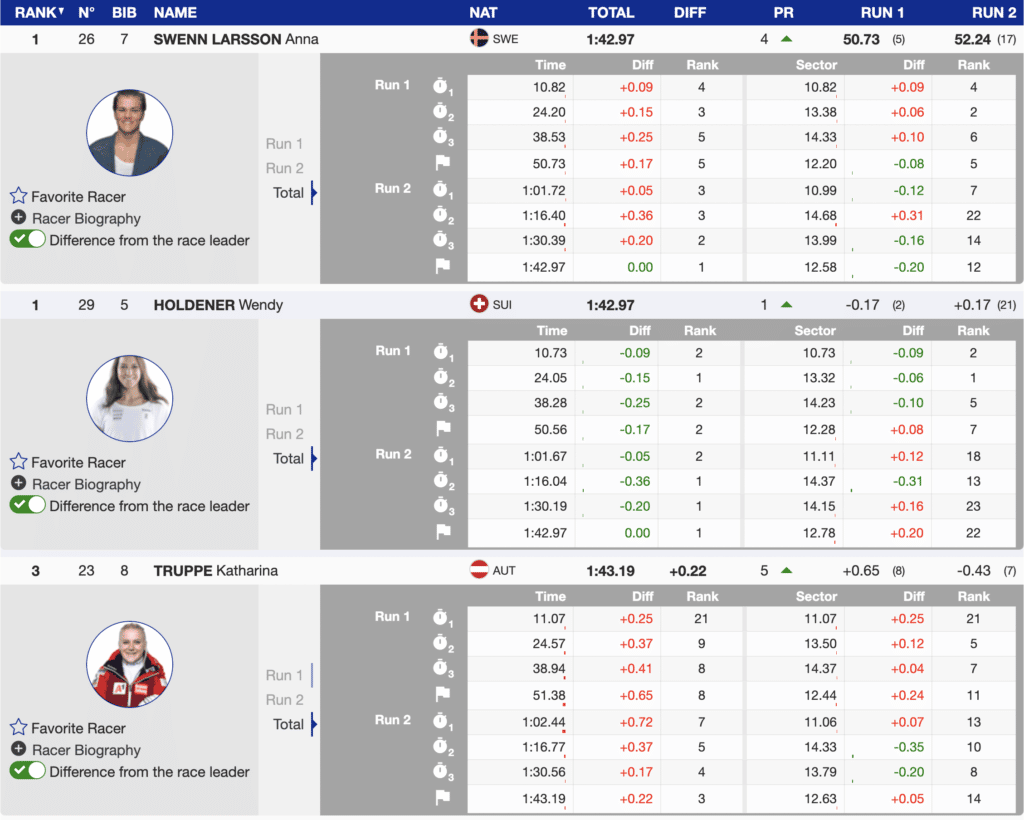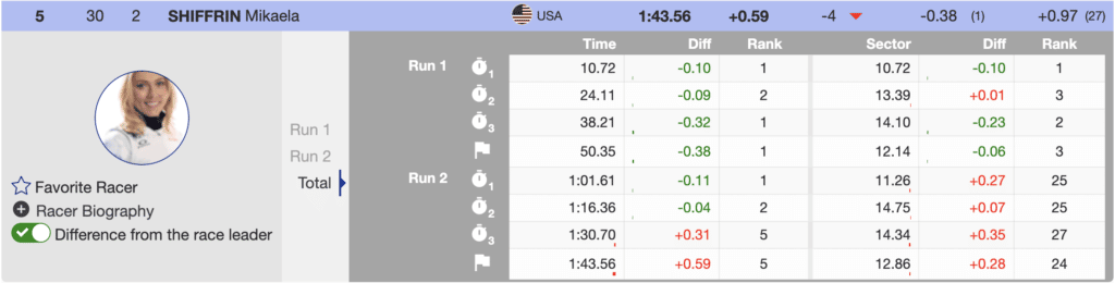 As predicted, the start numbers influenced the results. Bib 32, Austrian Franziska Gritsch, finished 30th on the first run and was first to ski the second course. By winning the run, she was able to move up 22 positions. Even though the skiers starting behind her had time advantages from the first run, her athletic performance combined with her start advantage proved too much for most to match.