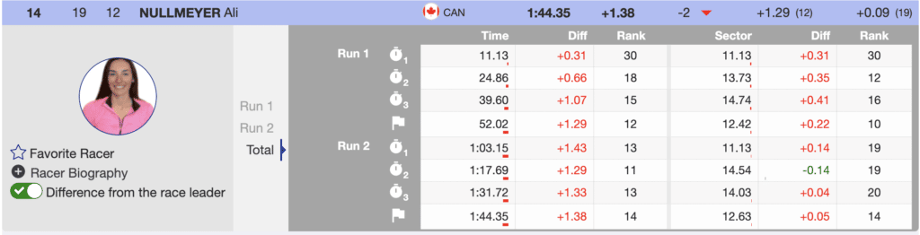 Additionally, Ali Nullmeyer of Canada and Middlebury College skied well and finished in the points; she was in 5th place when she finished the second run, but there were still many elite slalom skiers yet to start. However, she remained in the top 15, finishing 14th. Nullmeyer continues to show she is progressing upward in the sport.