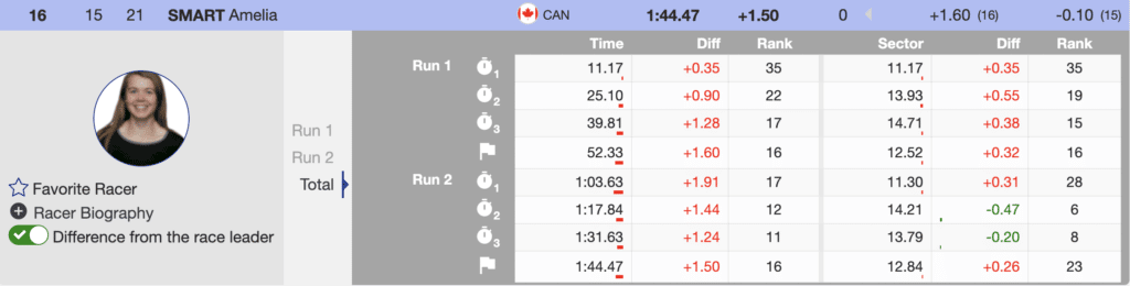 Canadian and University of Denver graduate Amelia Smart skied a good run and, after six previous attempts, scored her first Killington slalom points. When Smart finished, she was in second, but there were many more elite athletes to come. Smart finished a very respectable 16th place.