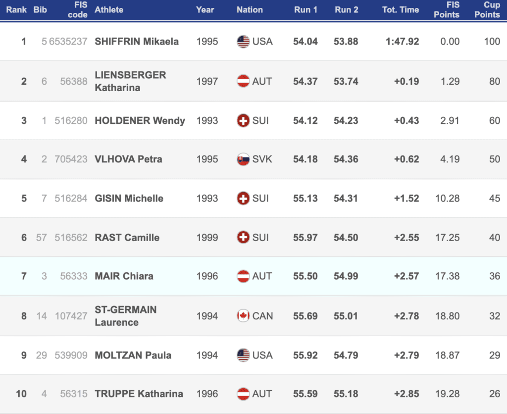 Michelle Gisin in fifth was 1.52 off the lead. Two weeks ago, Gisin won in another Austrian resort, Semmering, to become the first skier other the Shiffrin or Vlhova to win a World Cup slalom in 29 races since January 2017.