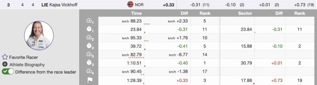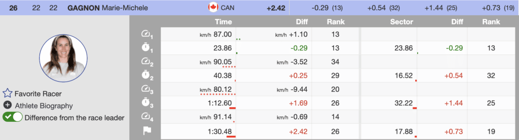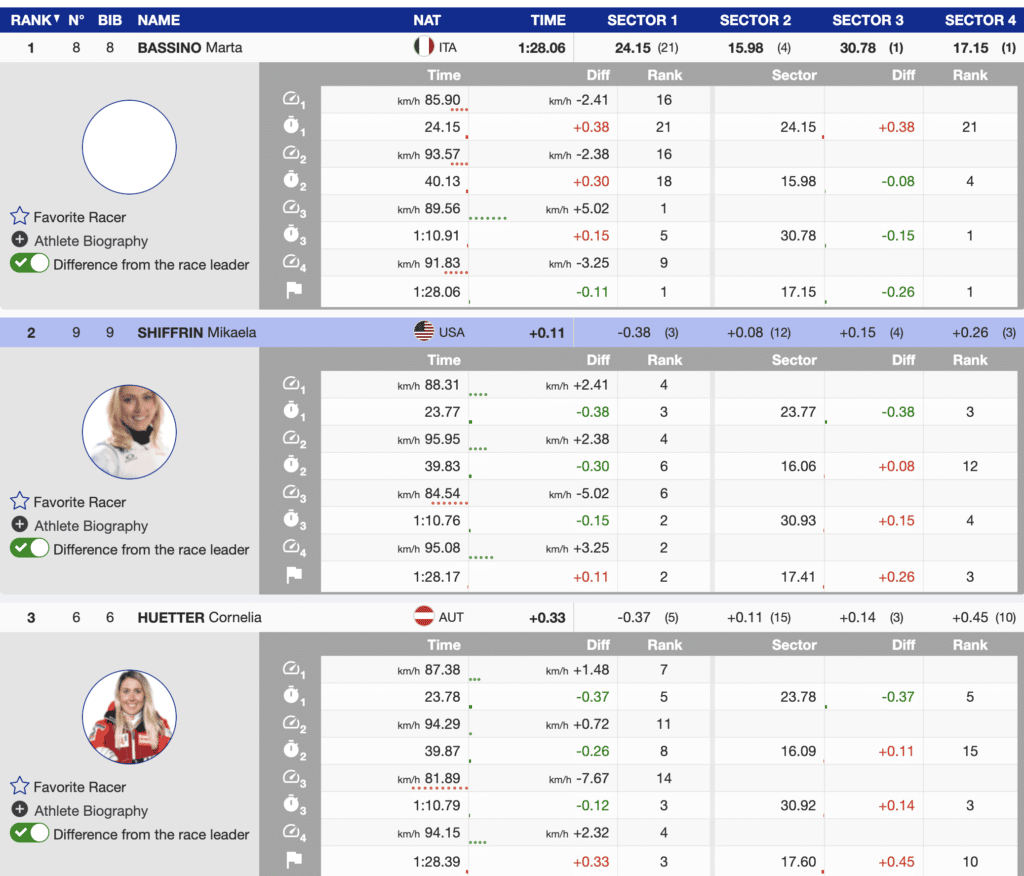 For the third World Championship race in a row, third place went to an Austrian. Today it was Cornelia Huetter. Like Shiffrin, she had the lead over Bassino with one sector to ski. Also, like Shffrrin, she lost time in the final turns and ended the day (+0.33) behind the Italian Bassino.