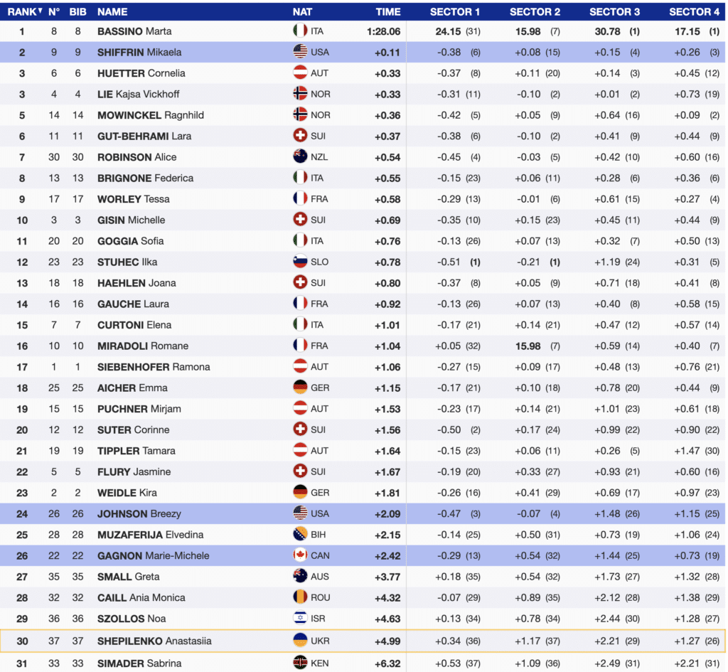 Bassino was the first of the prerace favorites to ski and the best. She is one of the smaller competitors, but once she completed the flatter top sector, her committed skiing was unmatched. The GS star skied the final two sectors better than anyone and, by locking her skis into the arc, maintained more speed through the finish than her challengers.
