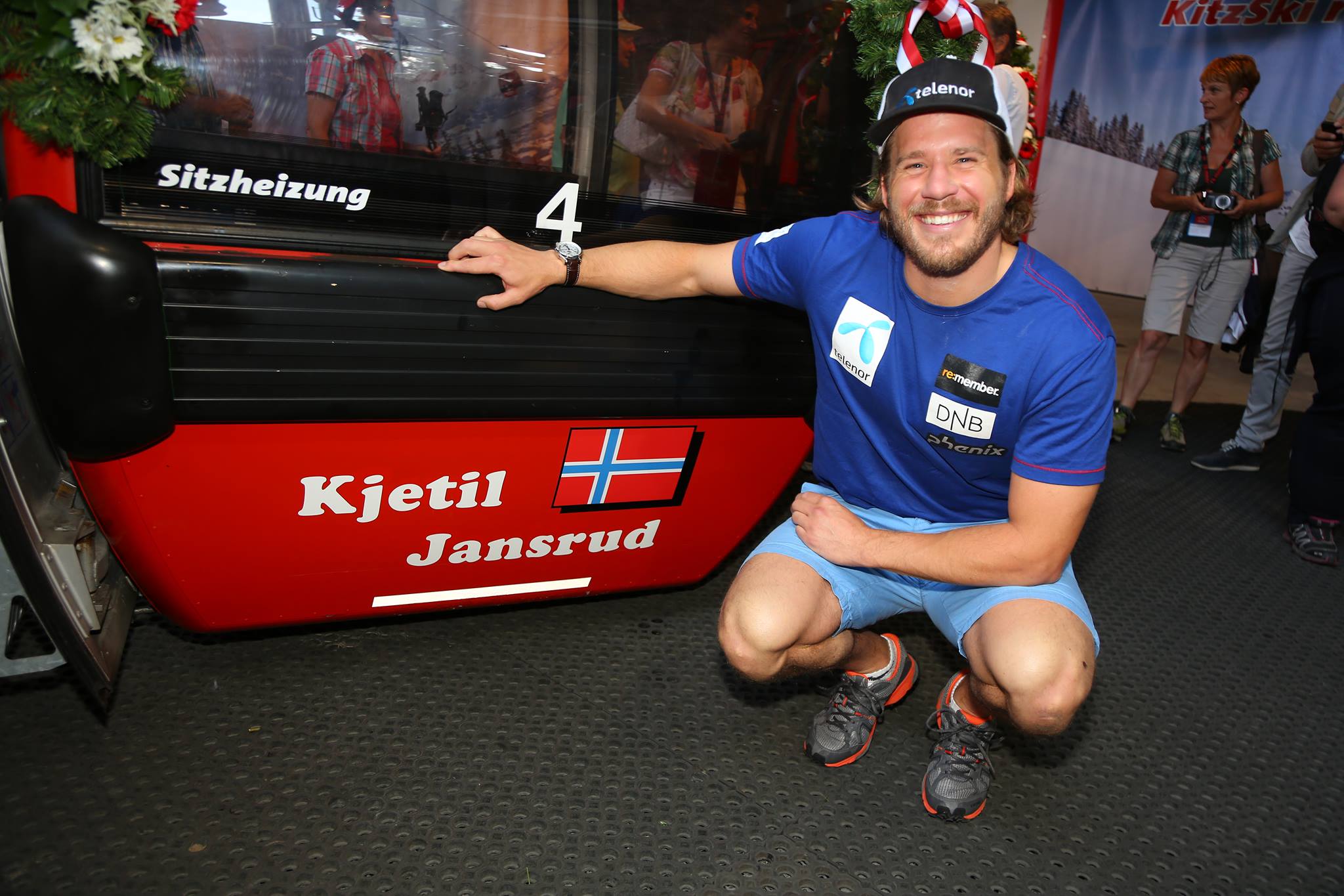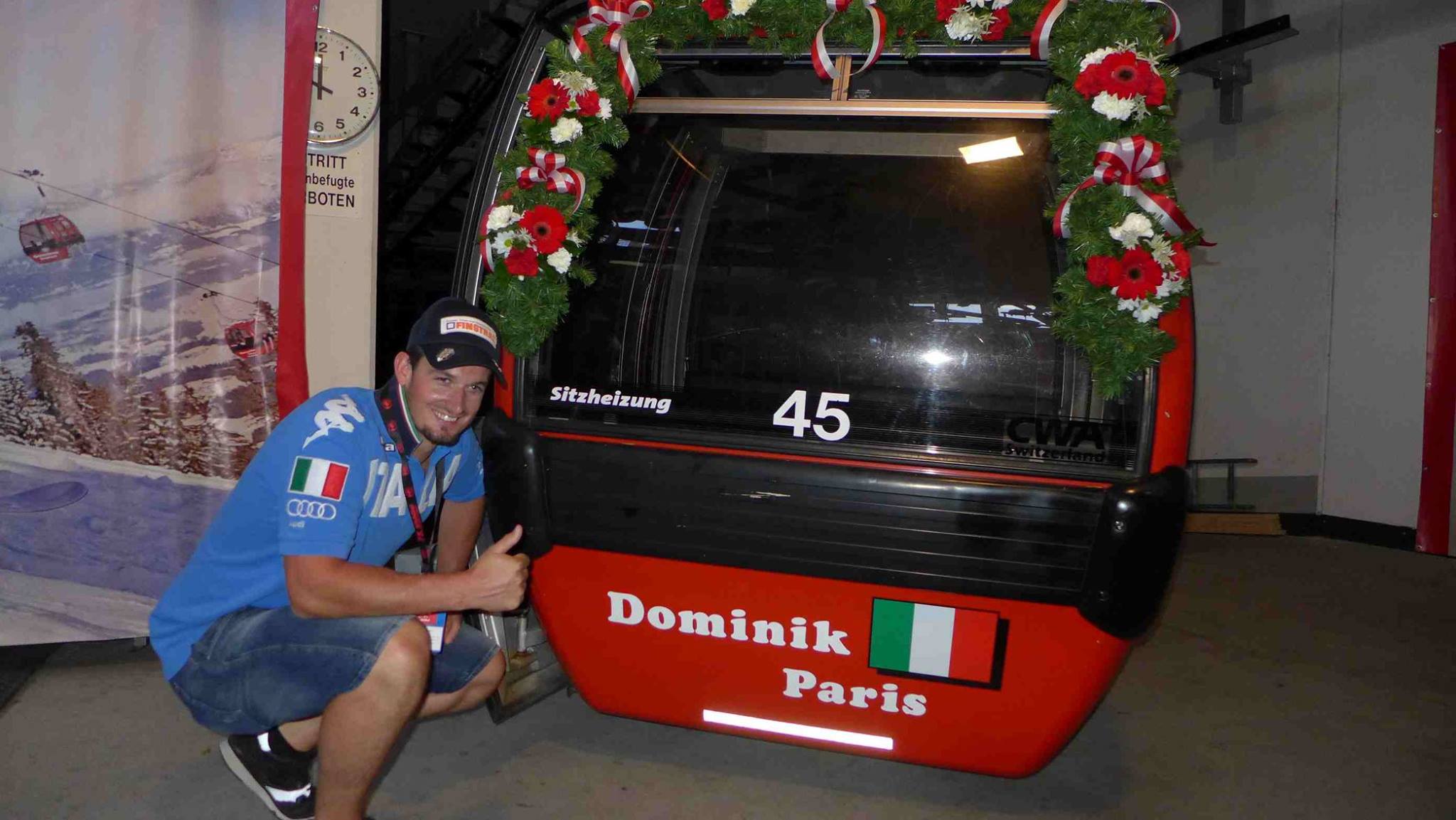 For some competitions, the fruits of victory continue to come in the summer. The 2015 Kitzbuehel race winners, Kjetil Jansrud in the Hahnenkamm downhill and Dominik Paris the super G, received their honorary gondolas at the famed Austrian venue today. In keeping with tradition, each speed event winner on the Streif is honored with a gondola car bearing his name and nation’s flag.