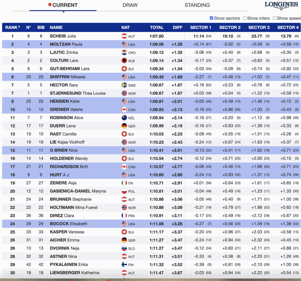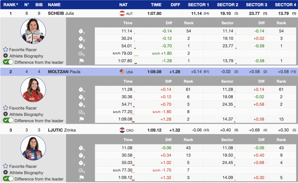 - Paula Moltzan produced a clean, fast run to sit second, +1.28 back, continuing her momentum from last season.