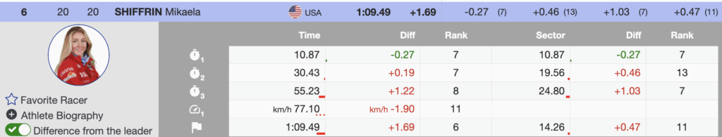- Mikaela Shiffrin, starting 20th after missing much of last winter with injury, attacked the course and crossed sixth, +1.69, in her first healthy GS since the crash in Killington, Vermont.