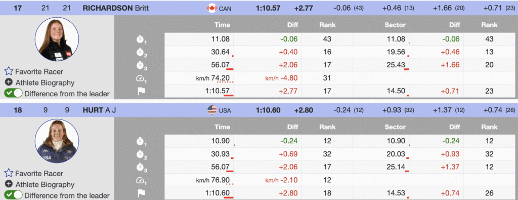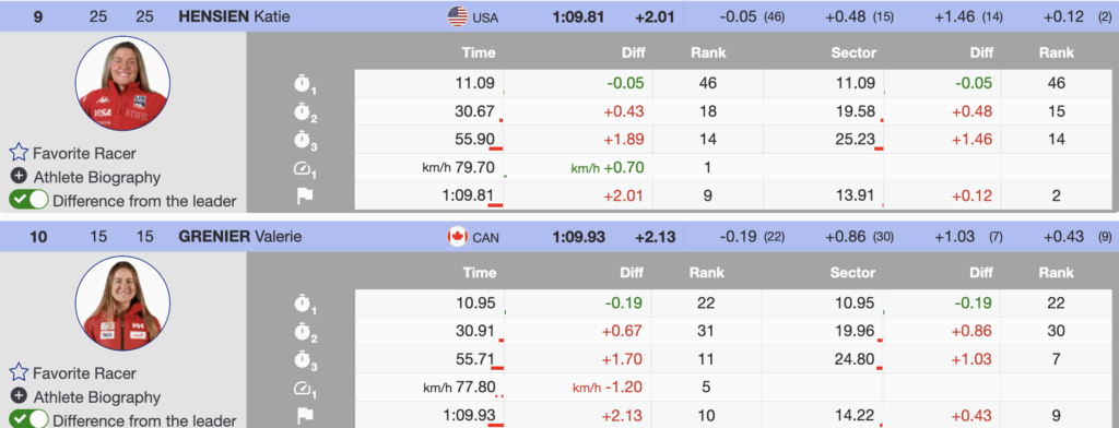- Valérie Grenier, a two-time World Cup GS winner, finished 10th (+2.13) after a solid but slightly conservative run.