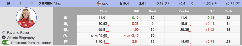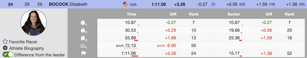 - Nina O’Brien sits 15th (+2.61), AJ Hurt 18th (+2.80), and the rising Elisabeth Bocock, wearing bib 29, recovered from a costly mistake entering the flat to finish 23rd (+3.26)—likely safely into the second run.