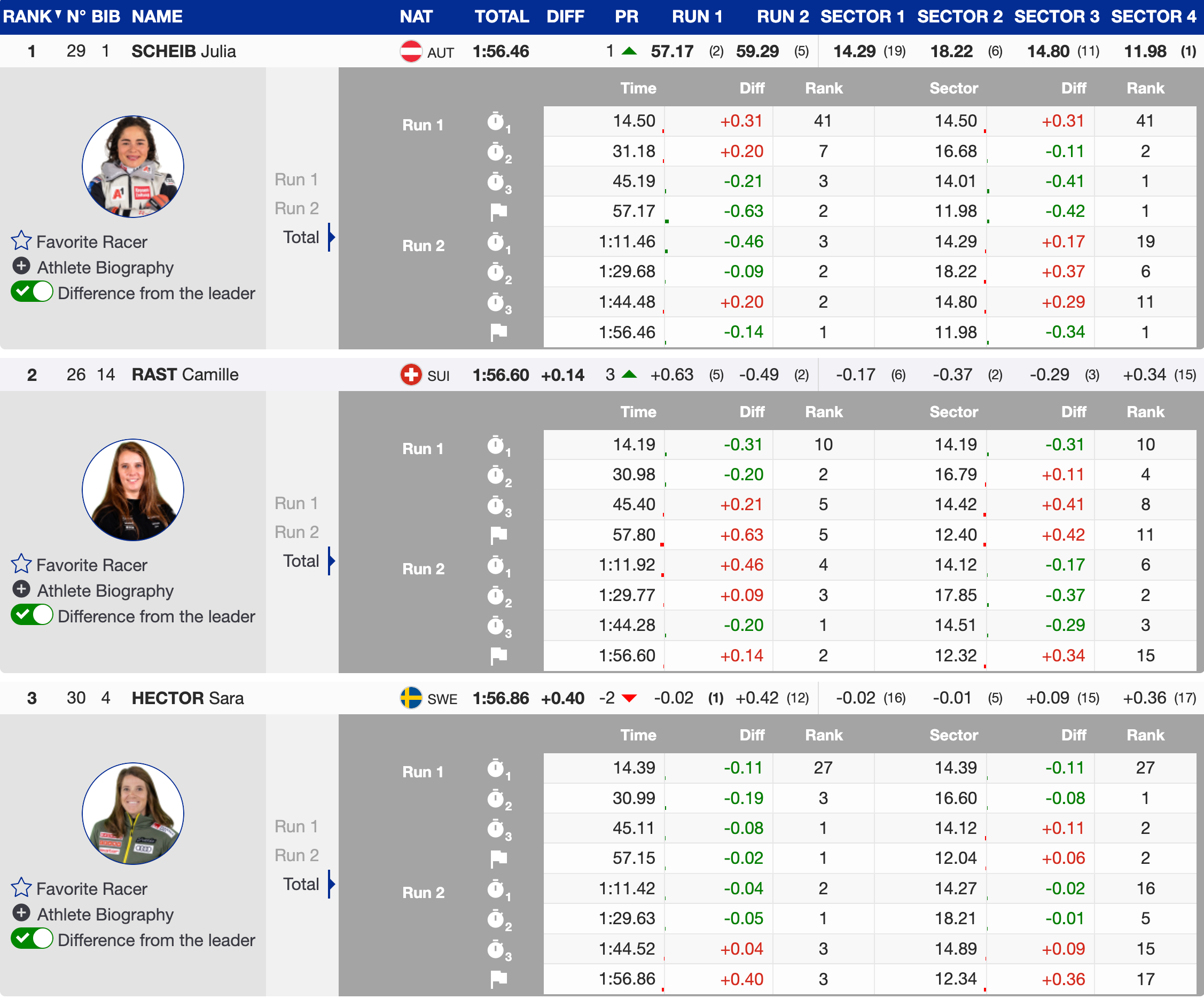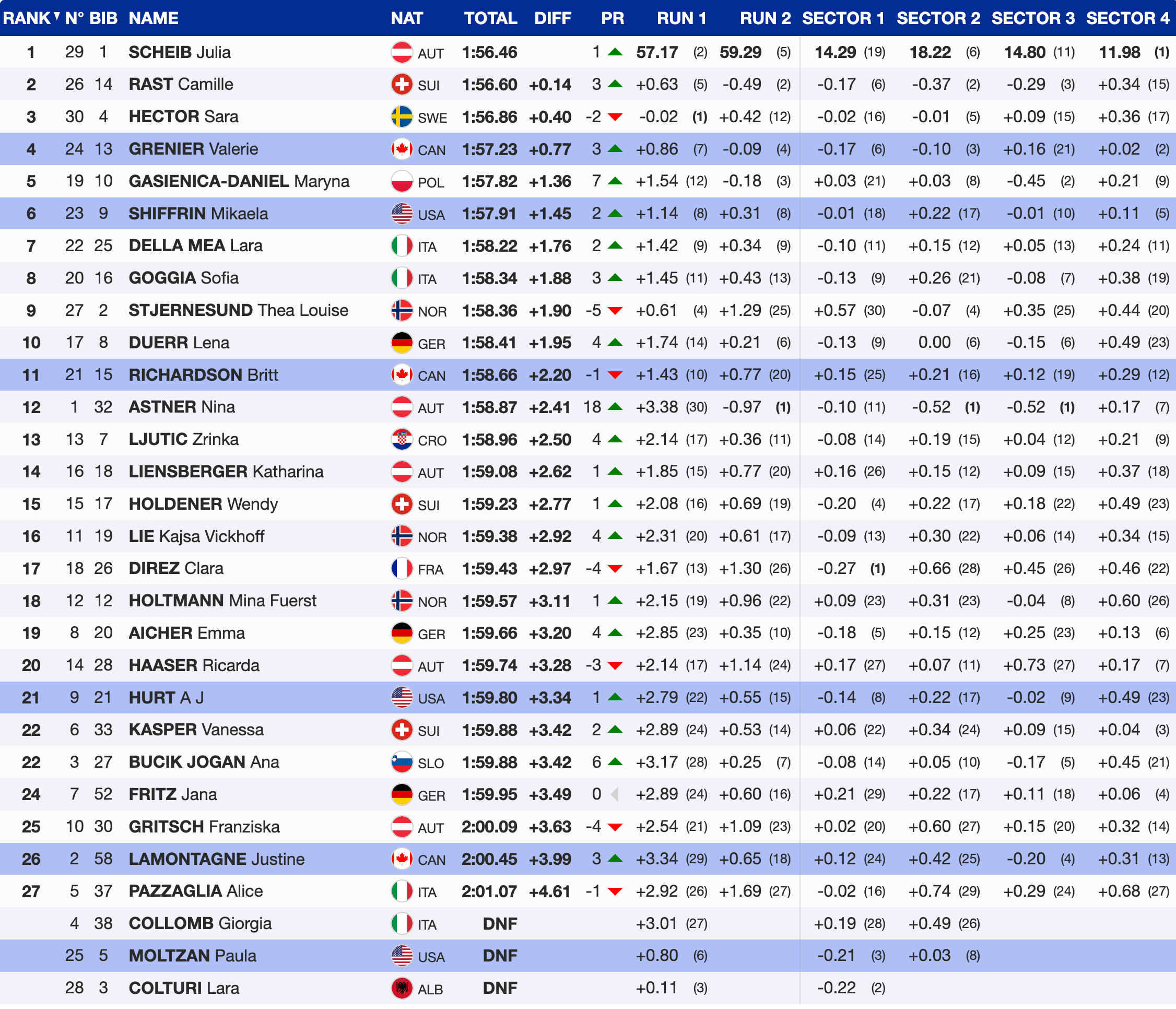Nina Astner (AUT) stole the show in the second run, putting down the most impressive run of the day. Starting 30th, she used flip 30 to her advantage and won the run by 0.48 seconds over Camille Rast, climbing 18 positions to finish 12th overall. Last season’s Europa Cup GS winner has been consistently breaking into the World Cup top 30, but today she shone on a challenging, bumpy course.