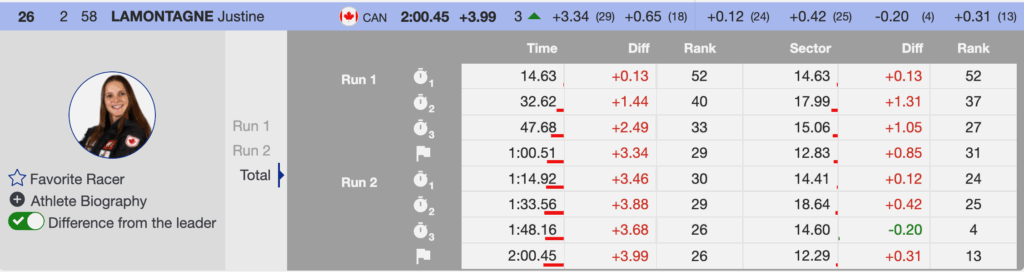 Justine Lamontagne (CAN) scored her first World Cup GS points today, finishing 26th today. The Montana State athlete demonstrated she belongs in the top 30 and can compete with the field, leaving the course with a huge confidence boost heading into the rest of the season.