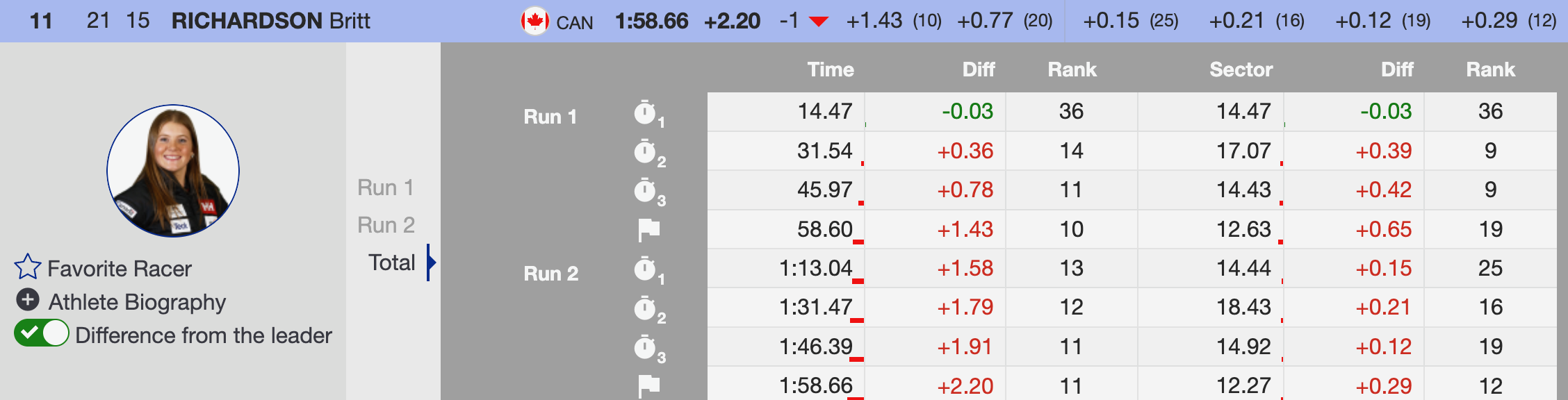 Britt Richardson (CAN) finished 11th after a few mistakes through the bumps, dropping one spot from her first run. She has the speed and skill to compete with the best, and with a cleaner, more aggressive line in the next GS race, she has every chance to move up the standings and make her presence felt.