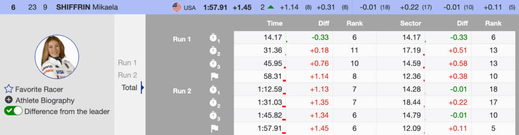 Shiffrin admitted she had some fear going into the run. “I was really quite scared, actually. I knew how bumpy it would be, and after the first run I didn’t feel confident that I could tackle it again. When I got to the finish, I thought, ‘Okay, I could do that again.’ For me, that was a big step today.”