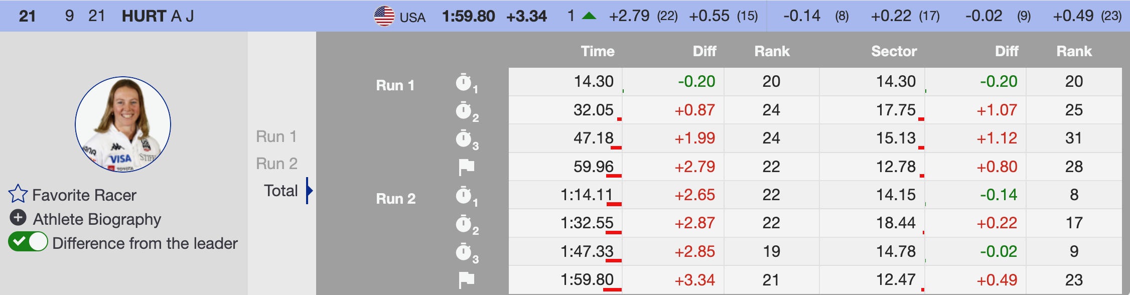 AJ Hurt (USA) made a solid return to the World Cup circuit after time away recovering from a hip injury, finishing 21st. This was a promising start as she works to regain her full speed, and we look forward to seeing her continue to improve.