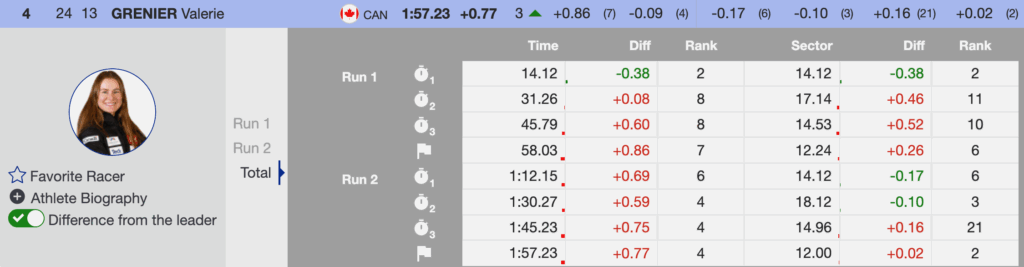 Valérie Grenier (CAN) was the standout among North Americans today, finishing fourth overall and putting down the fourth-fastest second run on a bumpy, dark track. She skied tactically smart, maintaining excellent speed and making precise line choices, an improvement from past GS races where she has sometimes cut lines too aggressively. Her performance today should give her plenty of confidence heading into the new year.