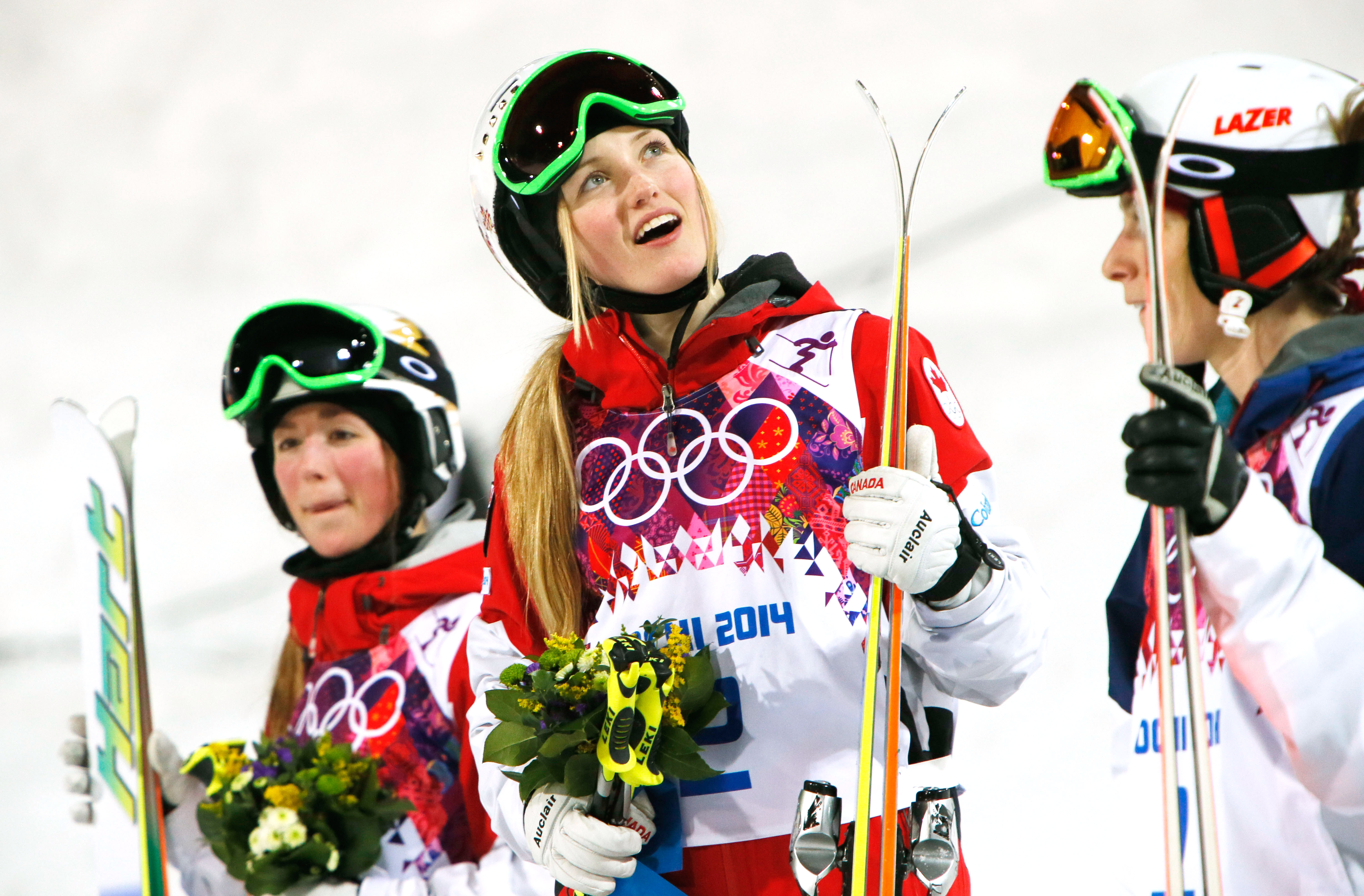 Two of three sisters to make the Canadian Olympic team, Justine and Chloe Dufour-Lapointe, earned gold and silver medals, respectively, fist bumping their bouquets of flowers on the podium, and holding hands before the announcement.