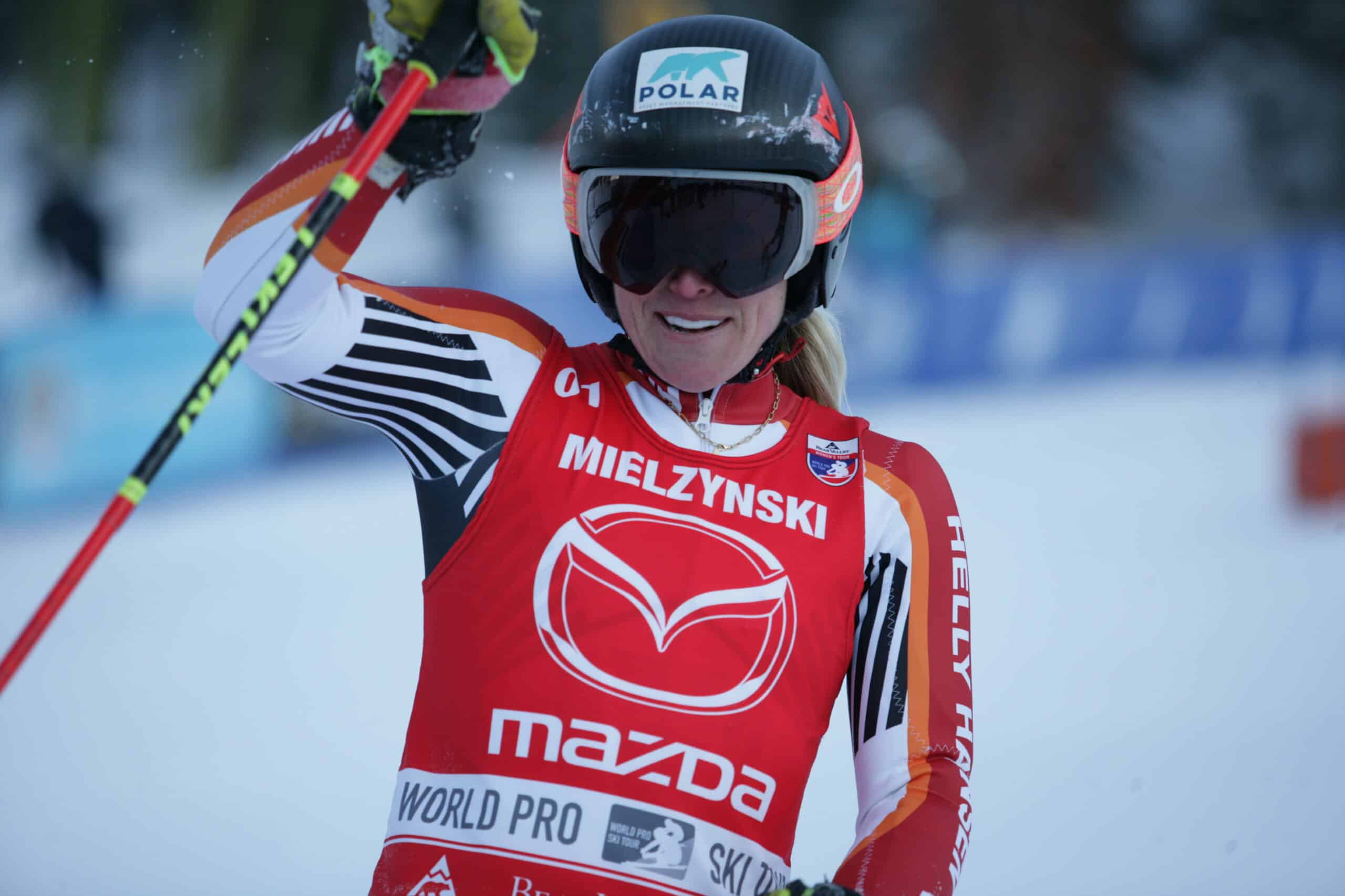 After an anticlimactic start to Saturday’s Mazda Far West Pro Classic women’s race, Mielzynski faced local athlete Michelle Morozinski in the quarter-finals. The Canadian handily won as Morozinski caught an edge before the last jump and did a dramatic tumble. Meanwhile, Slovakia’s Sona Moravcikova put up a solid fight against 2022 WPST women’s champion Tuva Norbye of Norway in the semi-finals, but Norbye fired ahead. As Morozinski relinquished the small final to Moravcikova, Norbye would face Mielzynski in the finals, both competing for their new team, Sportsinsurance.com. Although the Canadian dominated both final runs and ran away with the win, there were hugs in the finish area.
