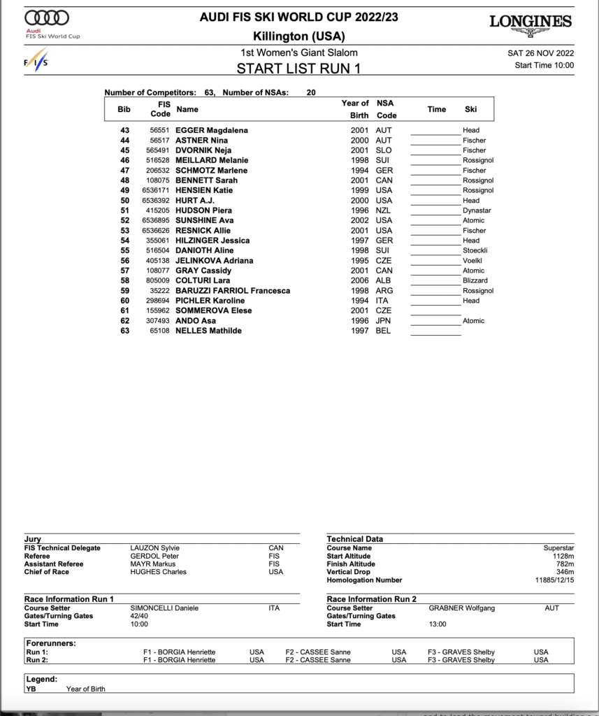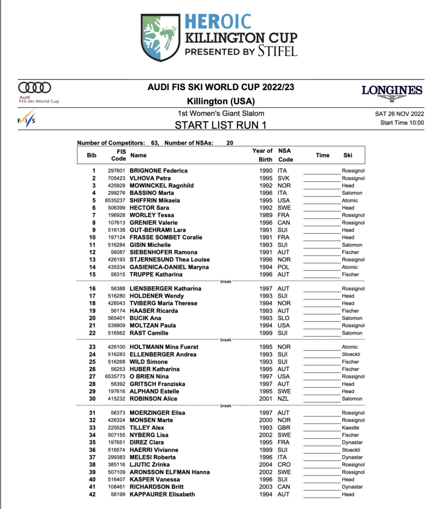 Eleven North American women are on the start list. The Stifel US Alpine Team is starting six women and Alpine Canada Alpin will start five. Reports are that the US women are skiing well, and if conditions cooperate, we could see many of them in the second run.