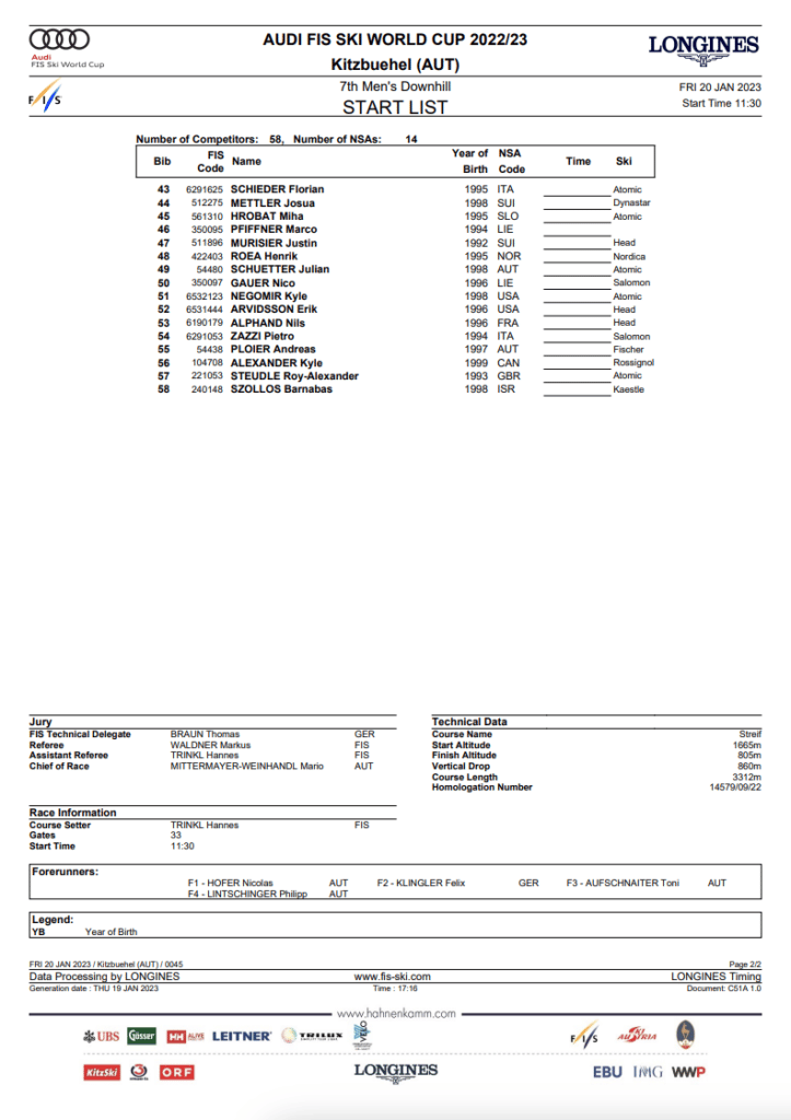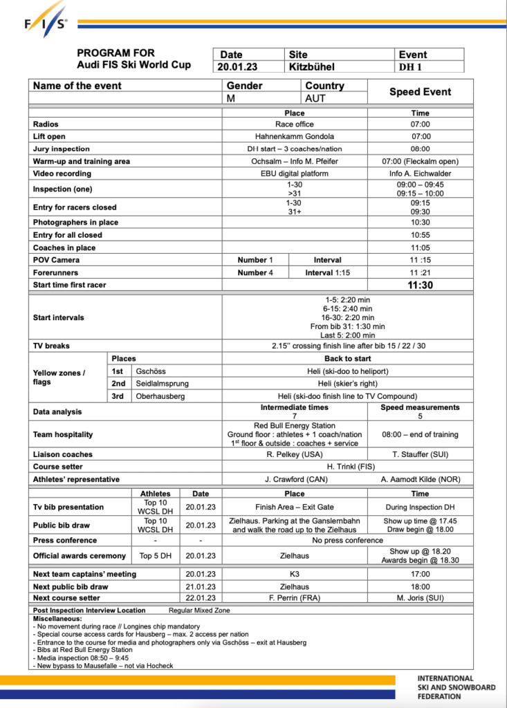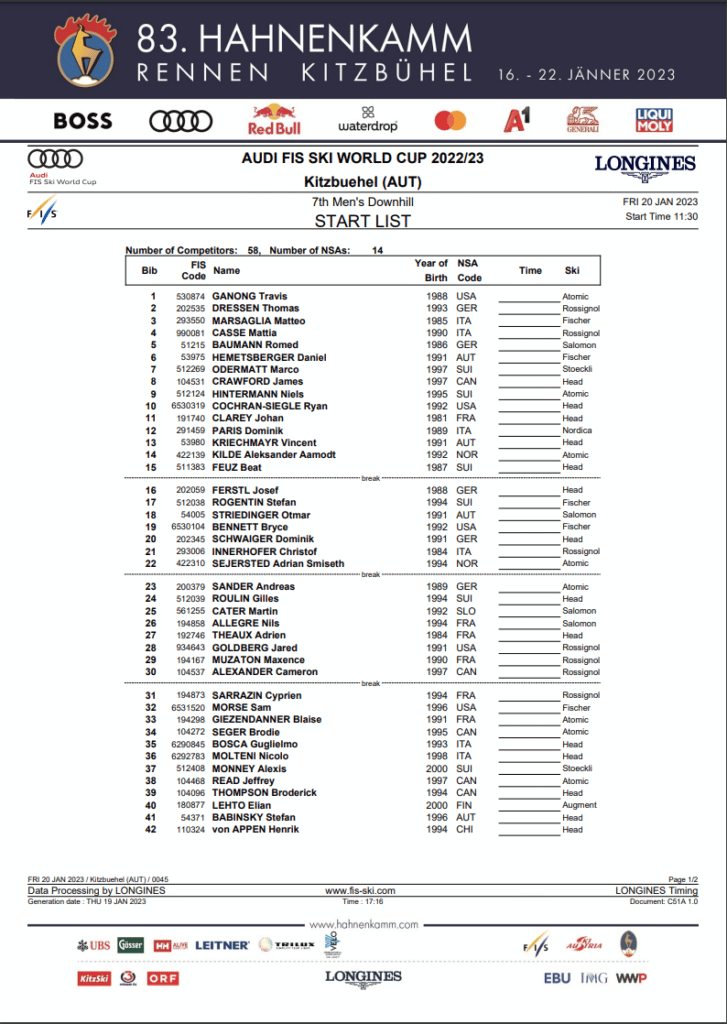 January 20th start list and daily program for the Kitzühel Streif downhill