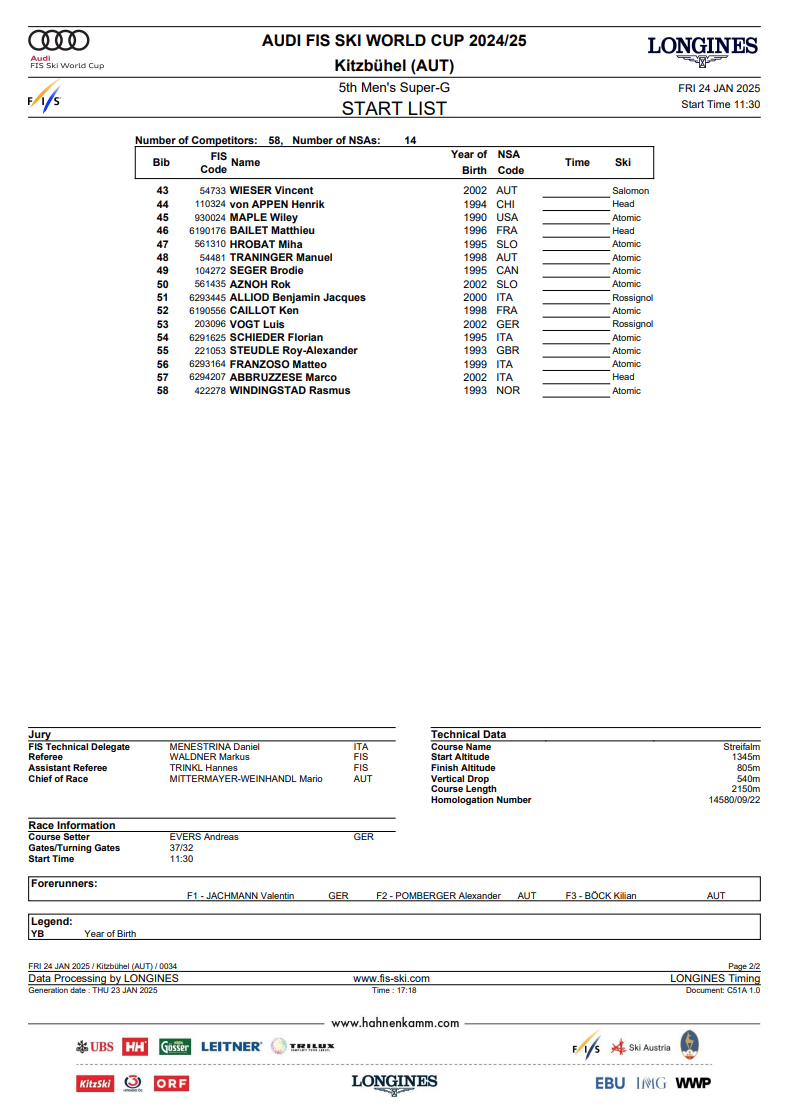 Fifty-eight athletes from 14 countries will compete in the Kitzbühel Hahnenkamm super-G on Friday, Jan. 27th. Former Herman Maier and U.S. Ski Team Coach A. Evers (GER) set the course