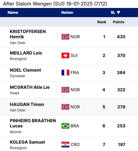This season has delivered a mix of established stars and rising talents. Noël, with victories in Levi, Gürgl, and Adelboden, has proven his ability to dominate. Kristoffersen, the leader, continues to rack up points with consistent podium finishes, including his win in Val d’Isère. Norway’s strength was on full display in Wengen, where Kristoffersen, McGrath, and Haugan swept the podium, further solidifying their dominance in slalom.