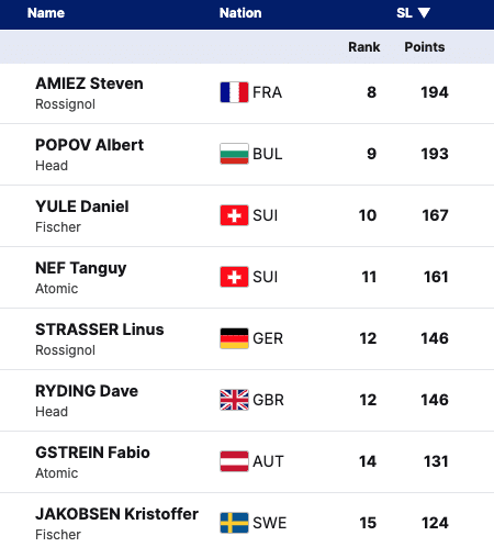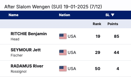 Jett Seymour follows with 44 points, ranked 29th. Seymour’s standout performance this season was 13th place in Alta Badia. With consistent improvements, he also has a strong chance to qualify for the season finale. Once the top slalom skier for the U.S., Luke Winters aims to return to the form that earned him a World Cup finals appearance in 2022.