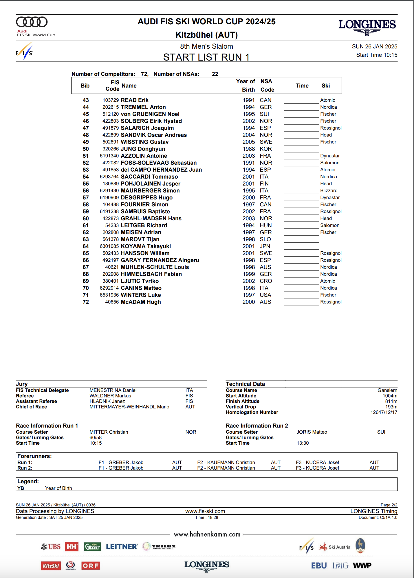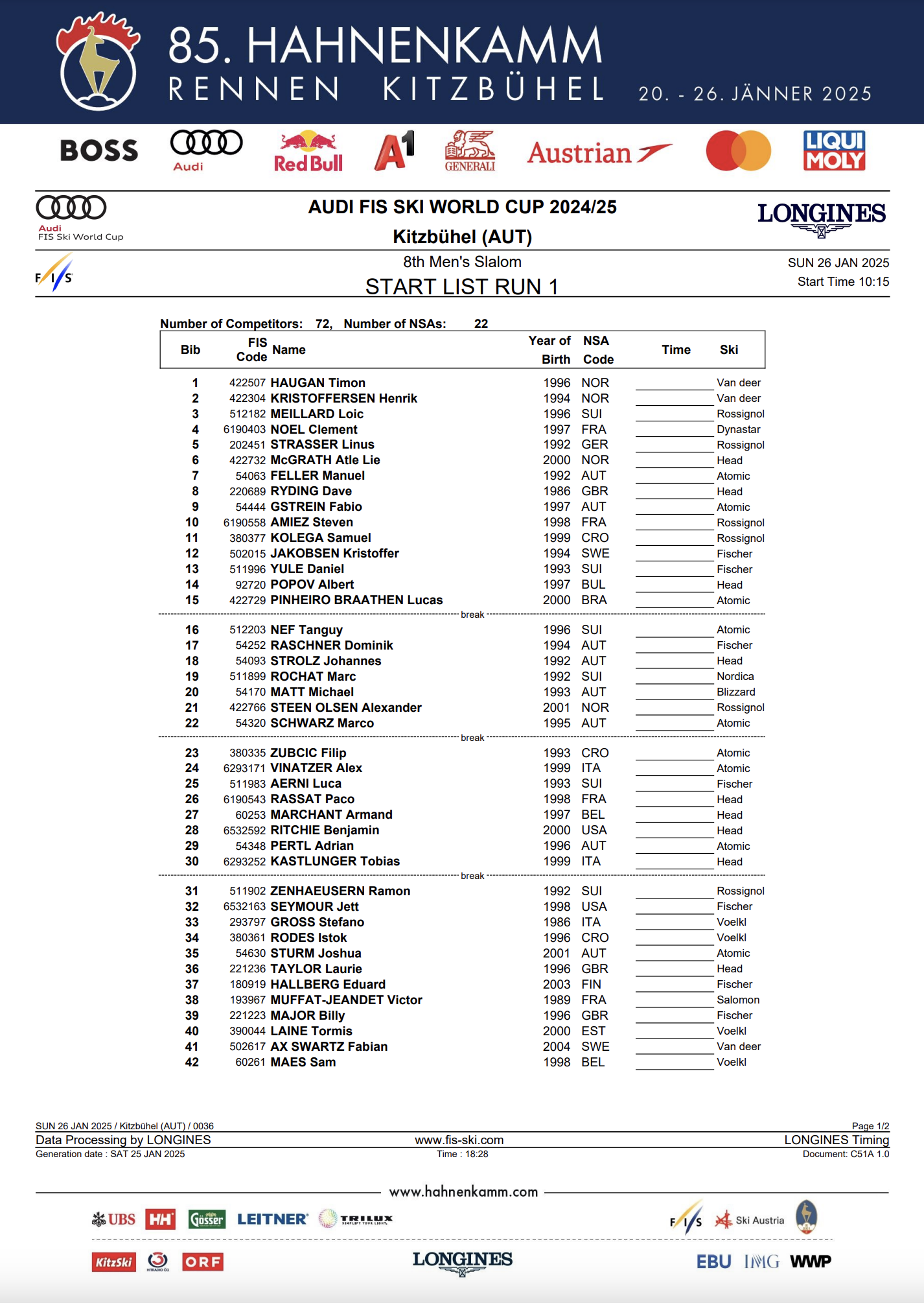 Seventy-two men from 22 nations will compete in the World Cup slalom in Kitzbühel on Jan. 26.