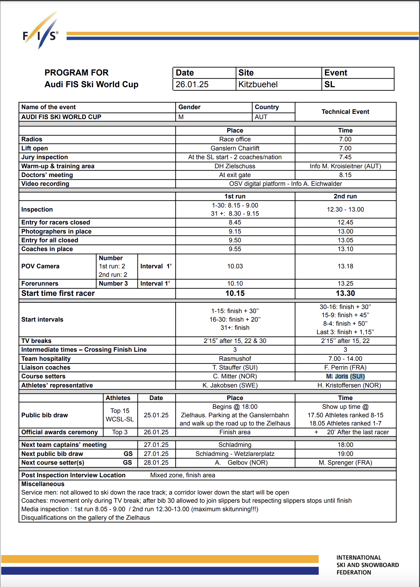 C. Mitter (NOR) has set the first run, and M. Joris (SUI) will set the second run.