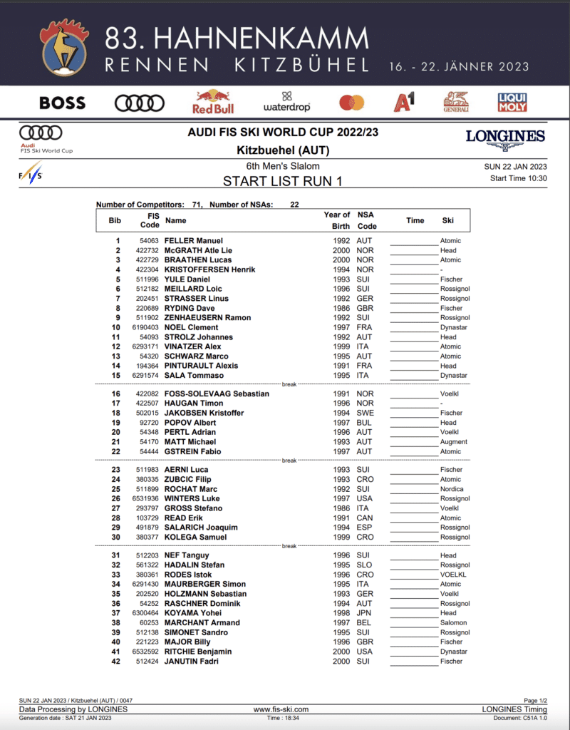We will see the amazing field of men’s slalom skiers solving the puzzle that is Kitzbühel. Will the home country crowd power Manuel Feller to the Austrian’s first 2022-23 slalom victory? Can they energize Olympic medalist Johannes Strolz to the podium? Can the Norwegians dominate another slalom? Or will the Swiss racer Loic Meillard finally get a victory to go along with his 13 podiums,
