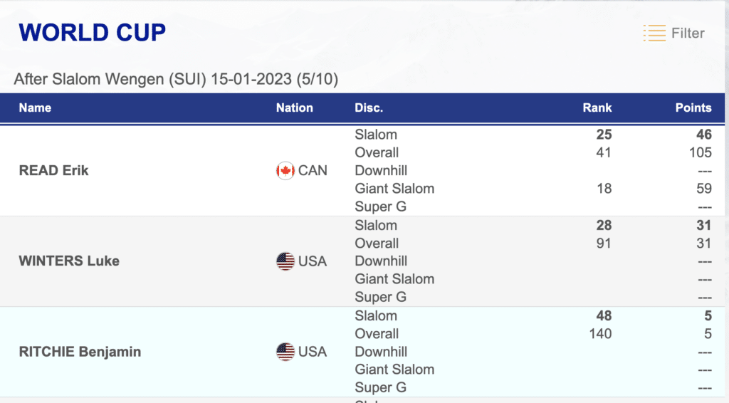 Following the Wengen race, North America has three male slalom skiers who have scored World Cup points. CAN Erik Read, USA Luke Winters and USA Benjamin Ritchie. In Wengen, for the first time this season, all three qualified for the final in the same race. However, if conditions are icy, all seven of the North Americans entered are capable of finishing the day in the top 30.
