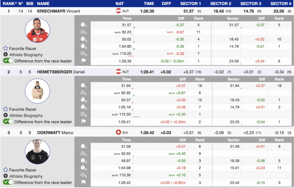 The winner of the first men’s super-G of the 2023-24 season is Austrian star Vincent Kriechmayr. Kriechmayr used high-speed skiing in sections one and three to finish a mere (-0.02) faster than his teammate Daniel Hemetsberger. The 2021 World Champion wins his eighth World Cup super-G of his career. Both Austrian men are 32, but today’s outcome represents Hemetsberger’s second super-G podium. The Austrians are joined on the podium by last season’s super-G champion, Switzerland’s Marco Odermatt. Even tighter than yesterday, the top three are separated by only three one-hundredths of a second.