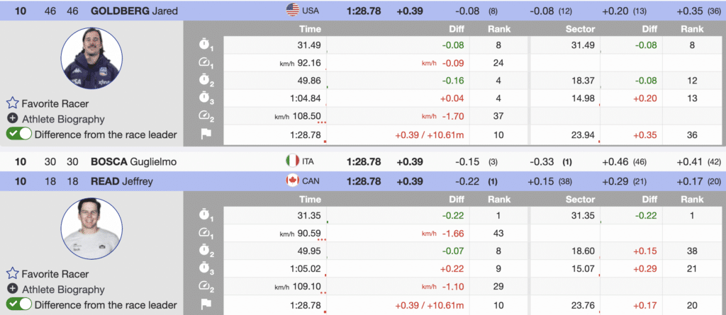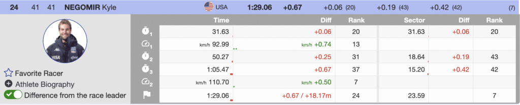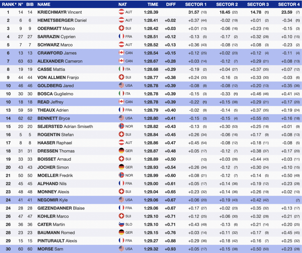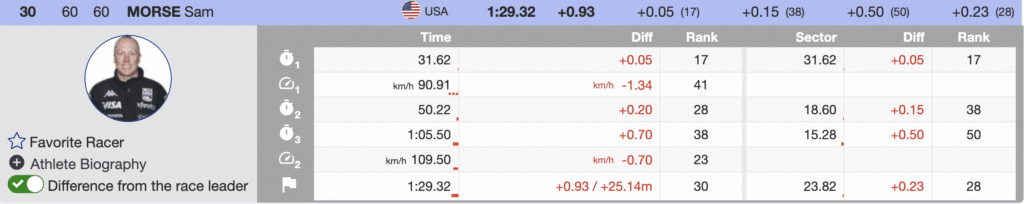 Also among the top 30 was bib 41 Kyle Negomir. Negomir used fast skiing in the first and final sectors to finish in the 24th. While he looked disappointed in the finish, the skiing was first-class, giving him positive momentum after the first super-G to start the season. His teammate Sam Morse ends his day with his first-ever World Cup super-G points. Morse finishes the day 30th (+0.93) and will start his season with a single point. Your first point in any event is a beautiful reason to celebrate.