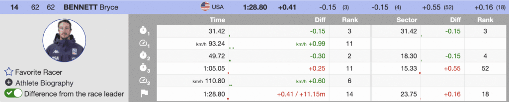 As expected, Odermatt skied well but lost time (+0.23) to the winner in the third sector. Ultimately, he reported that the course was much easier than expected and that he over-skied that section. However, his skiing in the race revealed he is prepared to defend his 2023 season super-G title.