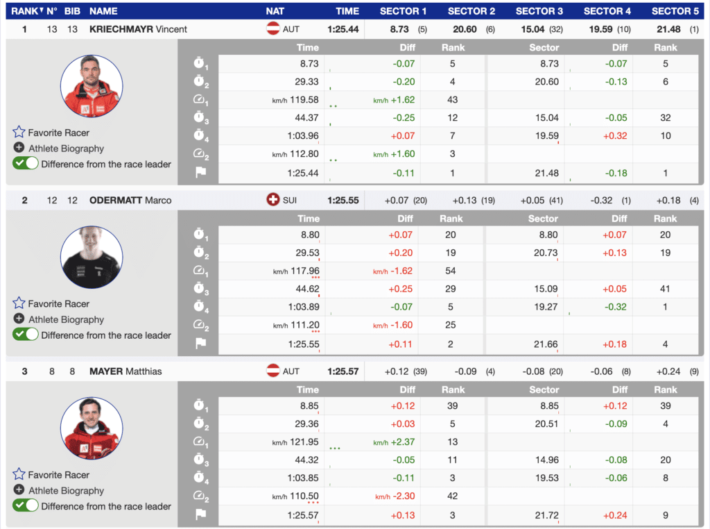 After Kriechmayr’s run, no one threatened the three at the top of the standings. Austria had a victory including two on the podium. World Cup overall leader Marco Odermatt split the Austrians, finishing second. Only 0.13 seconds separated the podium skiers.