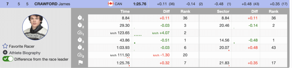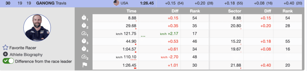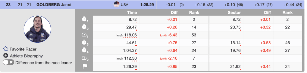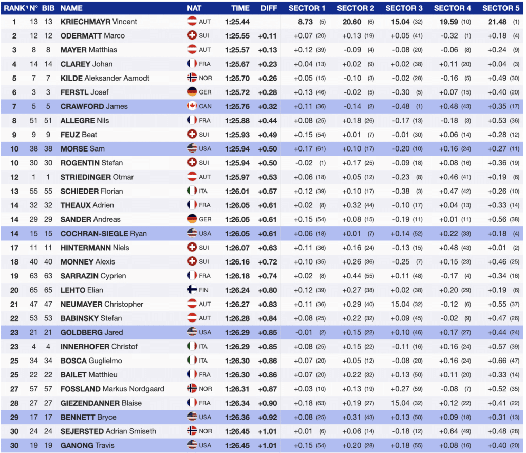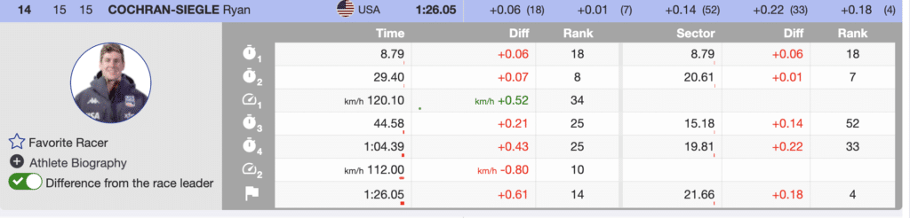Almost amazingly at the first tv break, Kilde was in fifth, but only 0.26 behind Kriechmayr. The shortened race was going to be tight. Unfortunately, bib 15, US’s Ryan Cochran-Siegle could not put himself into the lead-changing mix and crossed in 10th, 0.61 seconds back. The US’s best-ranked downhiller finished the day 14th.