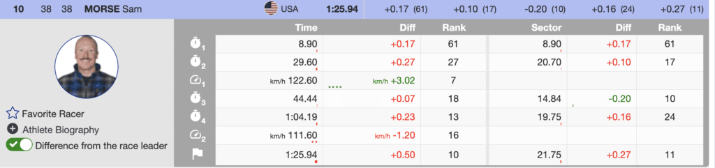 However, Val Gardena is known for providing opportunities for the later bibs and Morse was not the last one to take advantage. Nils Allegre of France skiing with bib 51 skied faster than Morse. Allegre had won the training run and now found himself in eighth place.