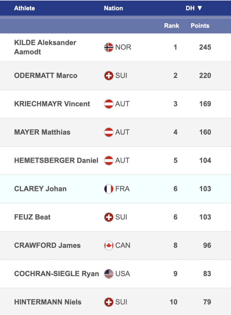 Current World Cup downhill standings