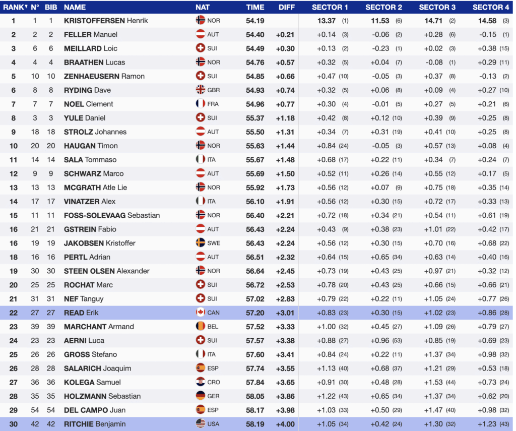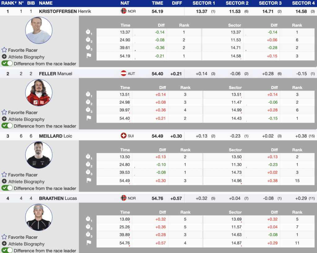 At the end of the first fifteen, Kristoffersen, Manuel Feller and Loic Meillard were first, second and third, with only (+0.31) separating the three. Current season slalom leader Lucas Braathen is fourth (+0.57) behind his fellow Norwegian. Norway, Austria and Switzerland are represented in the top five with the Kitzbühel runner-up British racer Dave Ryding sixth.