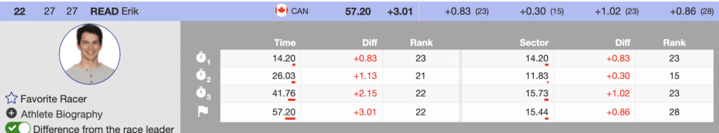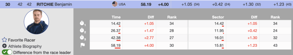 Canada’s Erik Read has been the most consistent North American to qualify for the final run this season. Read crossed the finish line (+3.01) behind the leader and qualified 22nd. However, today bib 42, USA’s Ben Ritchie (+4.00), 30th, will join Read. For the third time this season, Ritchie qualifies at the back of the field and will start the second run first. He skis fast when he has this opportunity, but has yet to finish the final run without a significant mistake. Today could be the day. He is more than capable of skiing at an elite level.