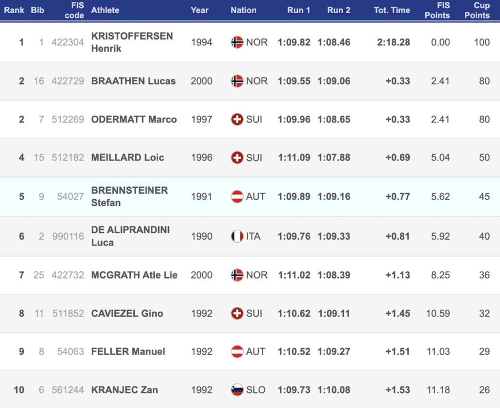 Defending overall champion Alexis Pinturault, who led the race after the opening run, dropped to 11th as his disappointing season continued. Pinturault is still chasing his first win of the season after earning three podium results so far.