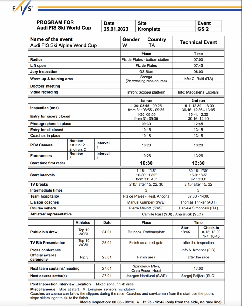Program for the January 25th Kronplatz women’s giant slalom