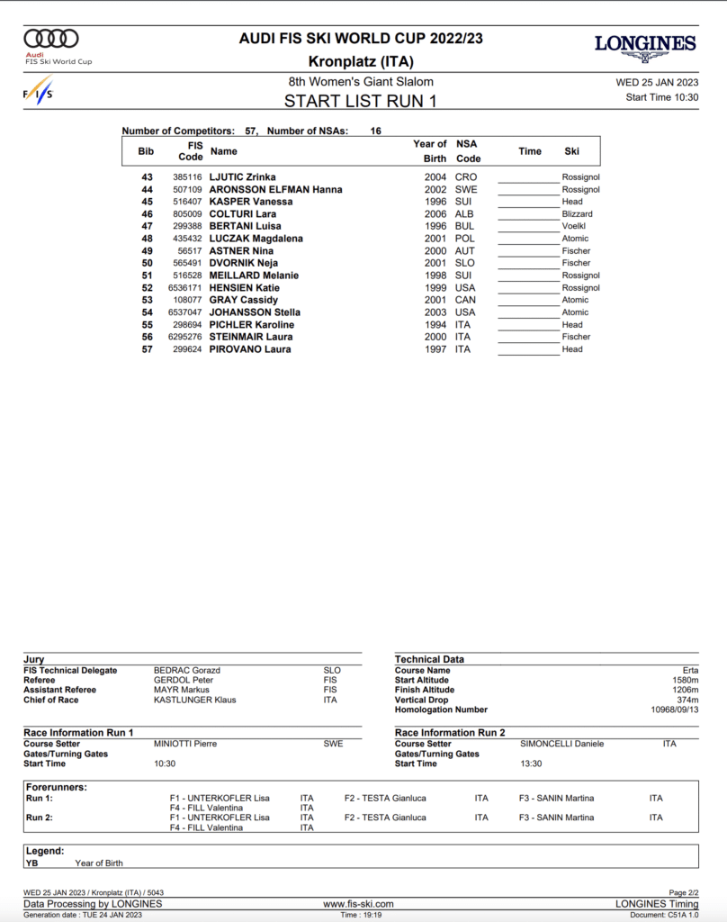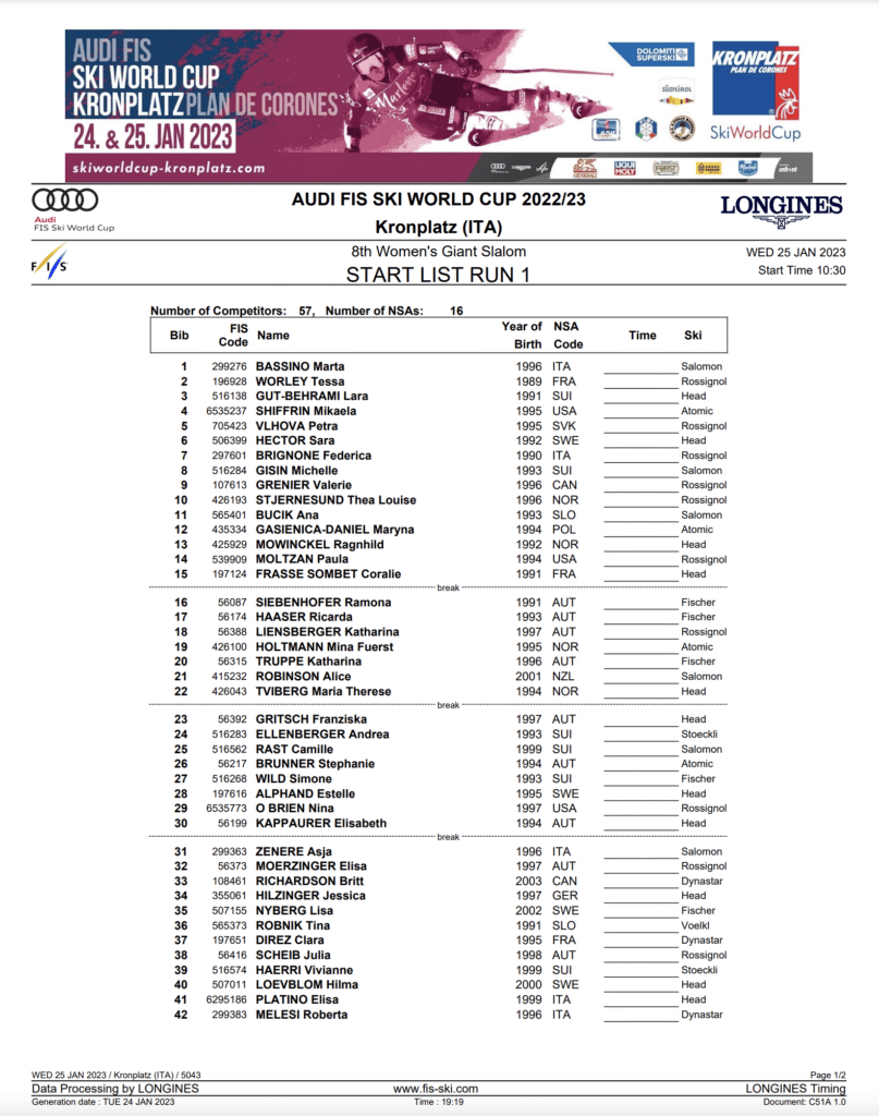 First run Start list and race program for January 25th, Kronplatz women’s GS