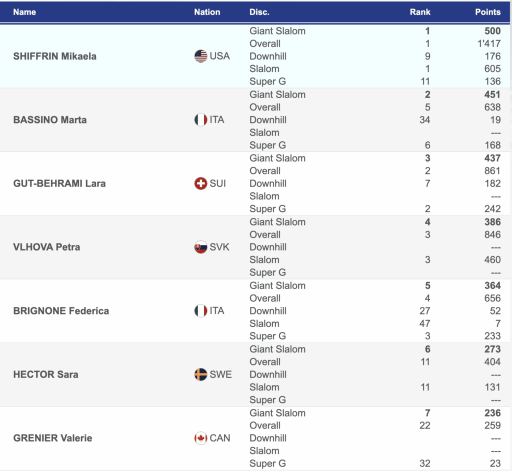 There have been seven women’s giant slaloms this season and we have seen four different winners. The Italian Marta Bassino has been on the podium five times and has one victory. Seven women from six nations have populated the top three. Mikaela Shiffrin has four podiums, but they are all victories. It is exciting. As of today, Shiffrin has taken the season lead in the giant slalom standings.