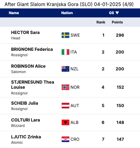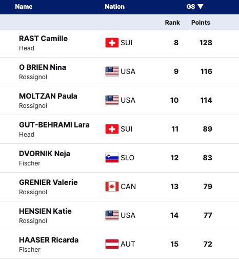 The top 15 GS standings highlight a diverse mix of nations showcasing their giant slalom talent. The United States leads with three athletes: Nina O’Brien, Paula Moltzan and Katie Hensien. Austria also has a strong presence with Julia Scheib and Franziska Gritsch, while Switzerland follows with two representatives, Lara Gut-Behrami and Camille Rast. Other nations with one skier in the top 15 include Slovenia (Meta Hrovat), Croatia (Zrinka Ljutić), Albania (Lara Colturi), Norway (Thea Louise Stjernesund), New Zealand (Alice Robinson), Canada (Valérie Grenier), Italy (Federica Brignone), and Sweden (Sara Hector).