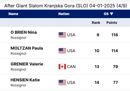 The U.S. team has demonstrated remarkable depth in Giant Slalom this season. Nina O’Brien leads the charge, ranked ninth in the GS standings with 116 points, closely followed by Paula Moltzan in 10th with 114 points. Katie Hensien, ranked 14th with 77 points, has been a standout, delivering consistent performances throughout the season. AJ Hurt, despite missing early races, has climbed to 28th with 30 points, while Elisabeth Bocock earned her first career GS points and is ranked 42nd with eight points.