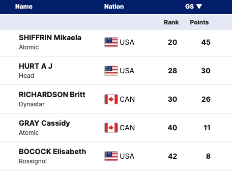 The Americans are missing Mikaela Shiffrin, who scored 45 points in her only complete GS race before injury sidelined her. However, their current lineup has kept them competitive in individual and Nations Cup standings.