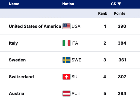 Last season, the U.S. finished third in the GS discipline behind Italy and Switzerland. The competition for the Nations Cup is far from over, and with five GS races remaining this season, every result will count.
