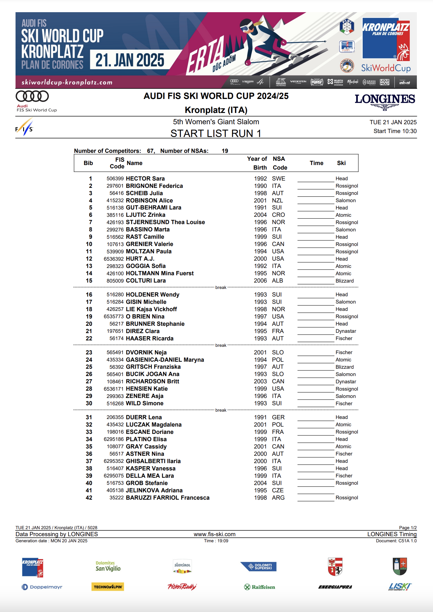 Sixty-seven women representing 19 countries are set to compete in the World Cup Giant Slalom in Kronplatz, Italy on January 21.