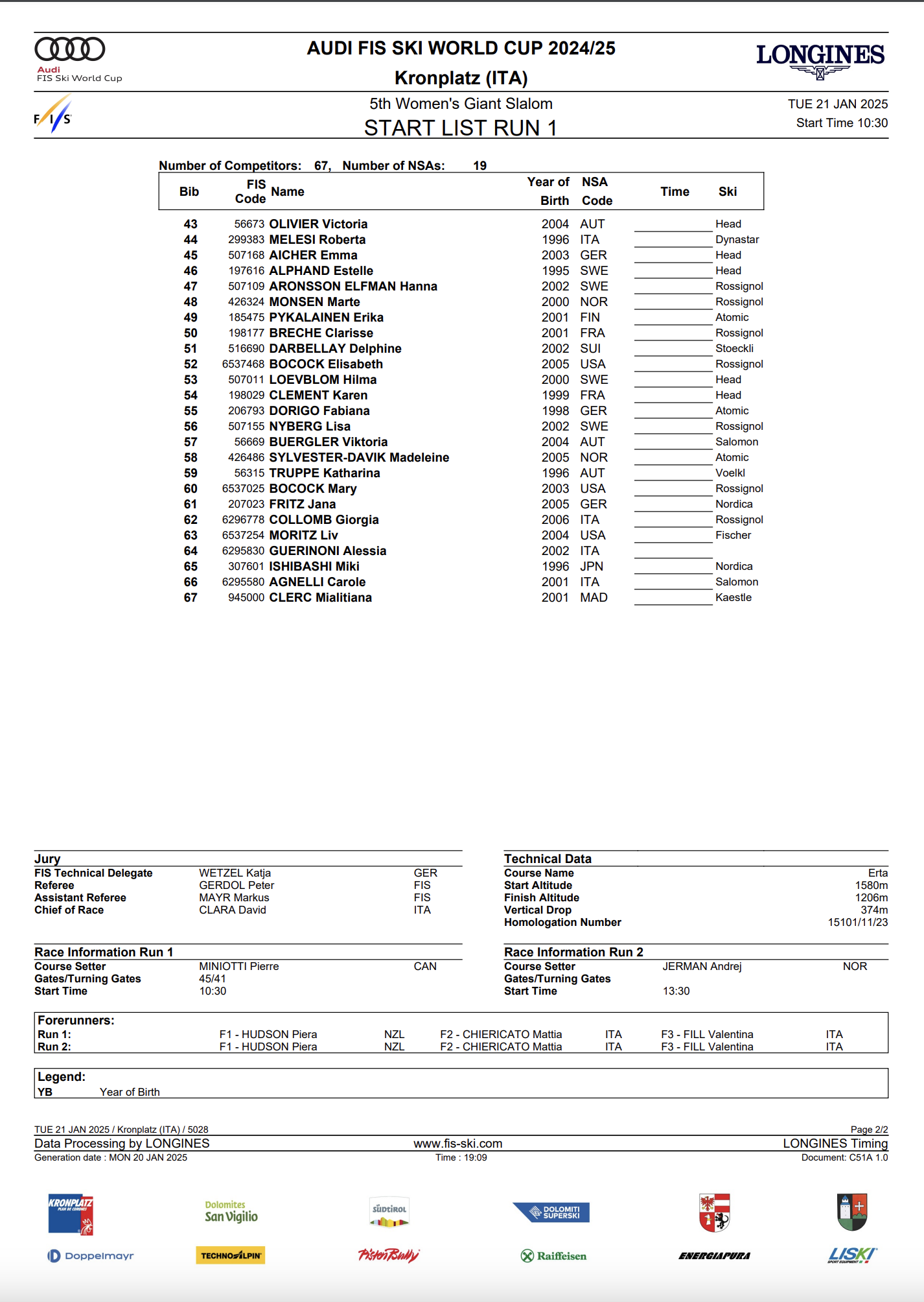 This breakdown highlights the competitiveness across nations, with talent spread broadly among the top ranks. Kronplatz, as the final GS before the World Championships, will serve as a critical proving ground for athletes aiming to solidify their standings and make their mark ahead of Saalbach. The race is shaping up to be a pivotal moment in the season.