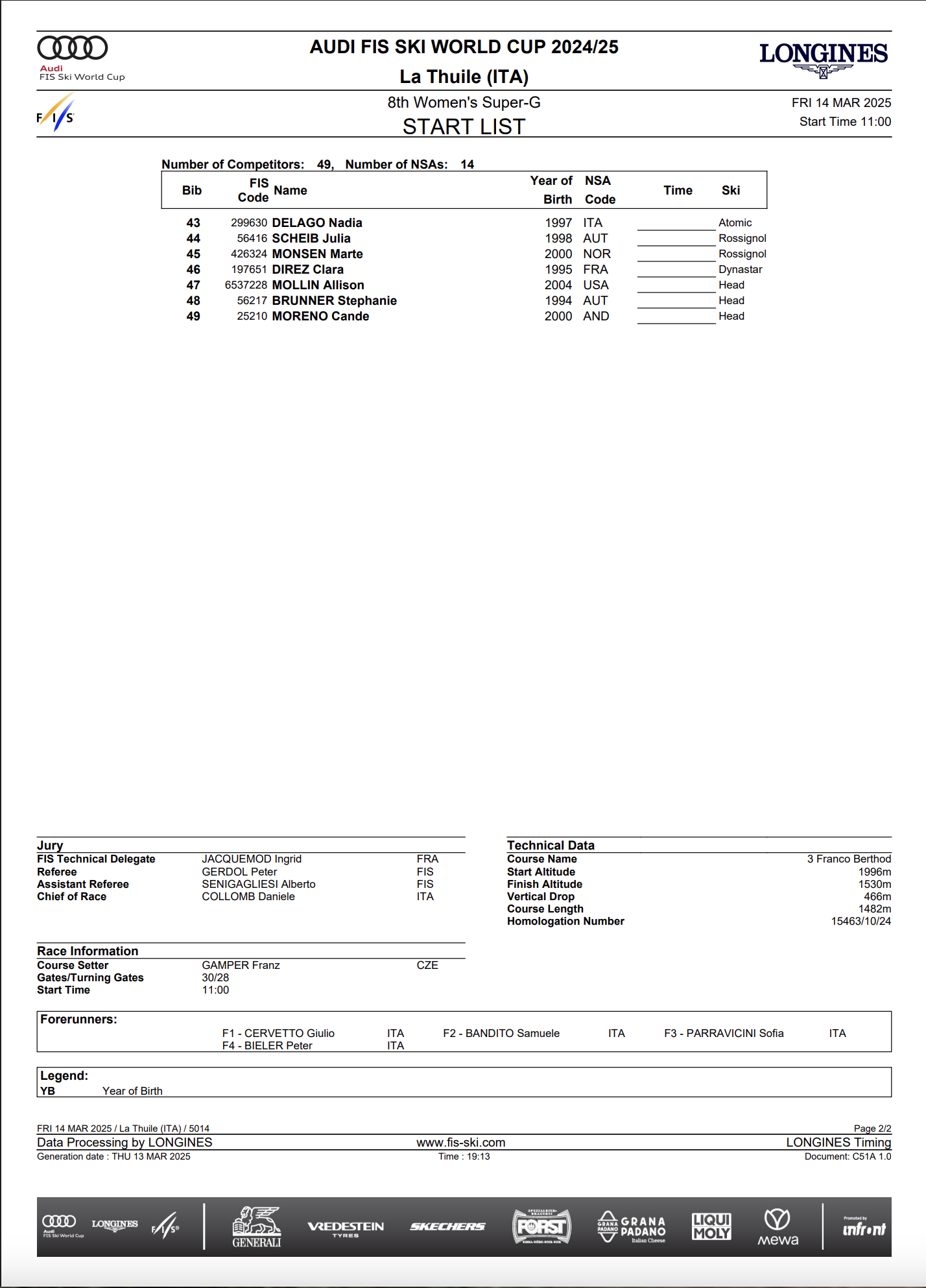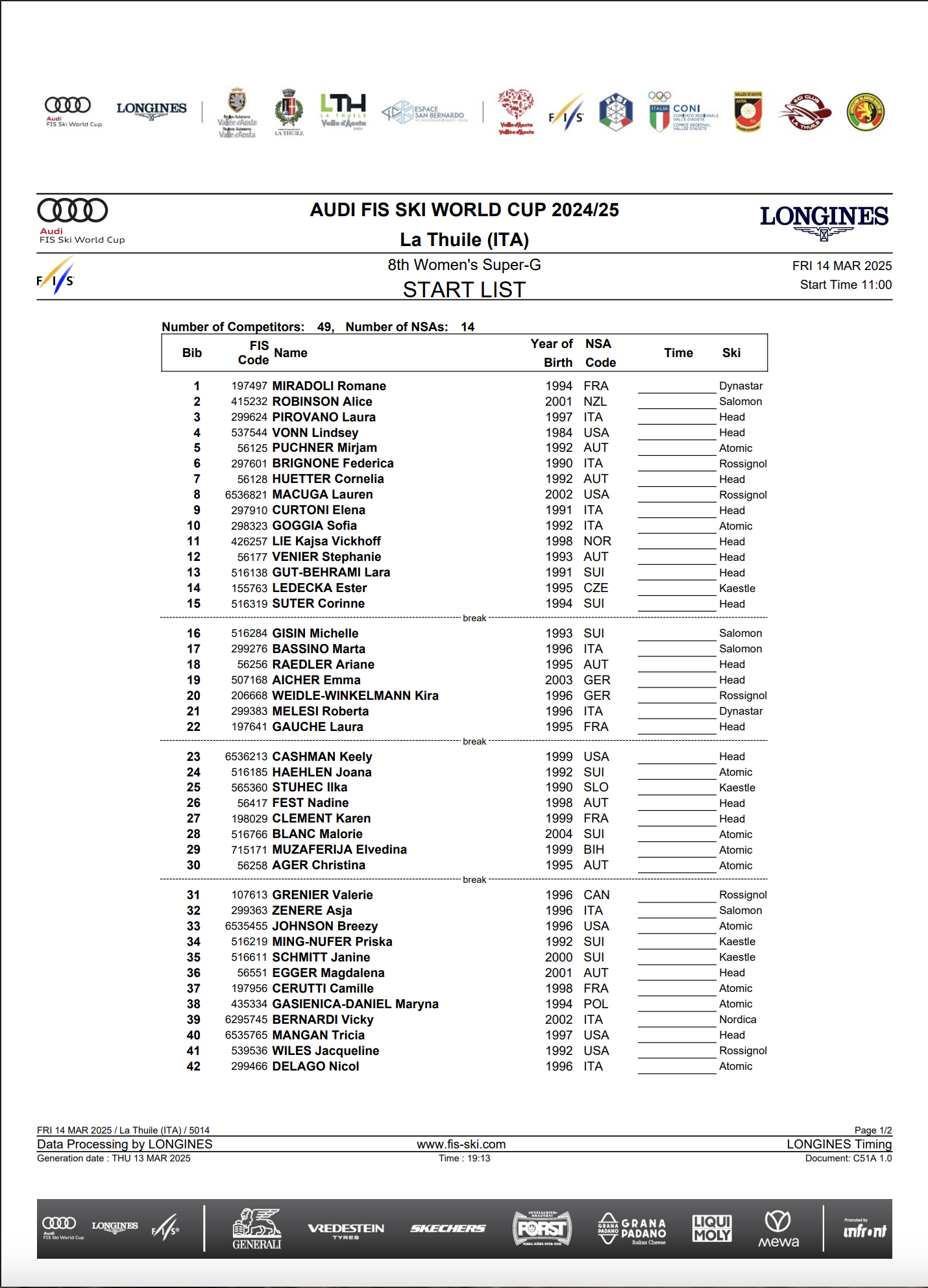 Forty-nine women from 14 countries are listed to compete in the Mar. 14 La Thuile, Italy Women’s super G.